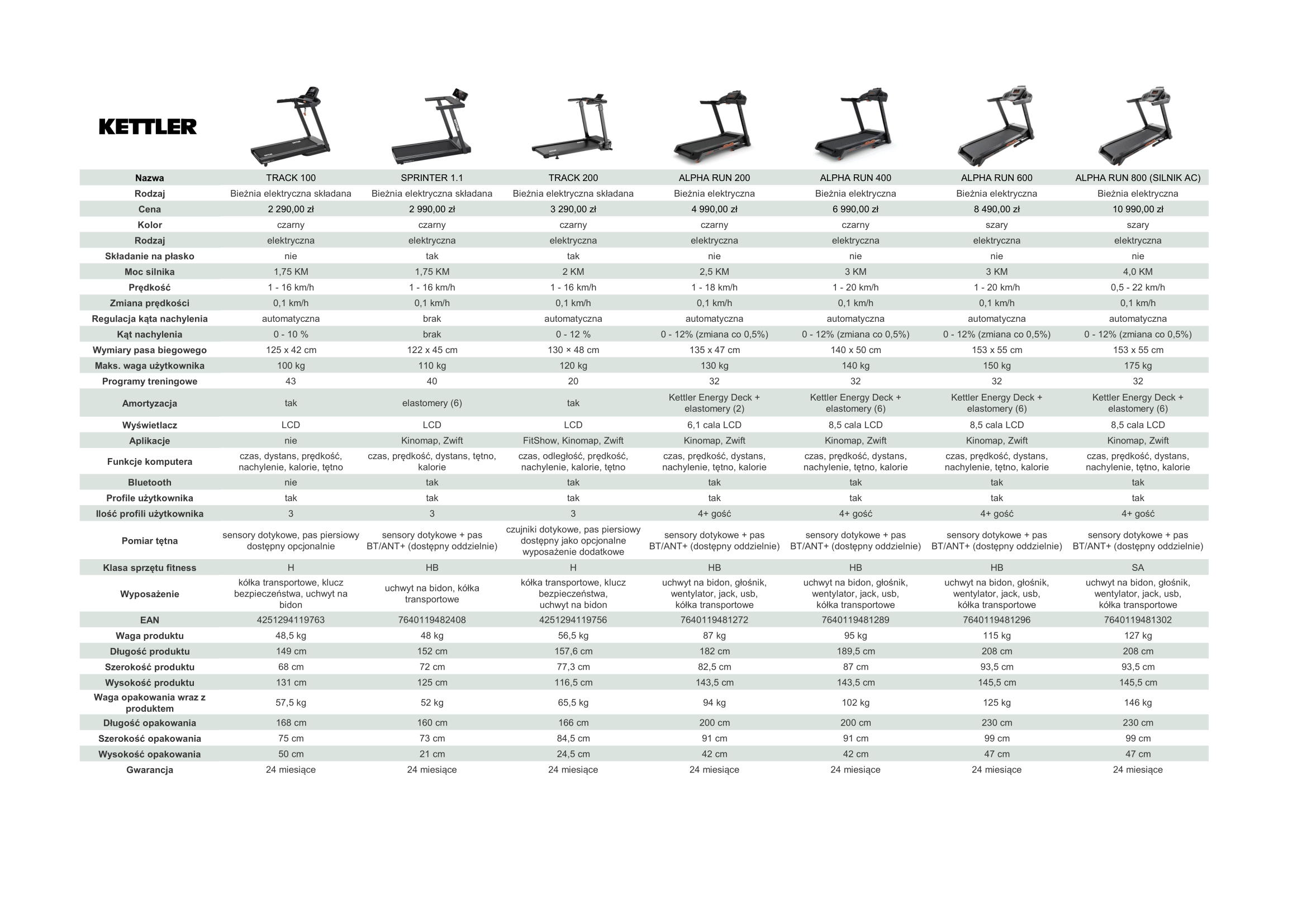 KETTLER ALPHA RUN 800: to model z silnikiem o mocy 4 KM, prędkością maksymalną sięgającą 22 km/h. Ta bieżnia posiada aż 32 programy treningowe, a 12% kąt nachylenia pozwoli na dostosowanie poziomu treningu. Maksymalna waga użytkownika to 175 kg.