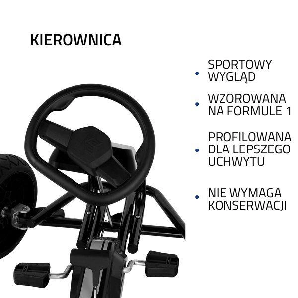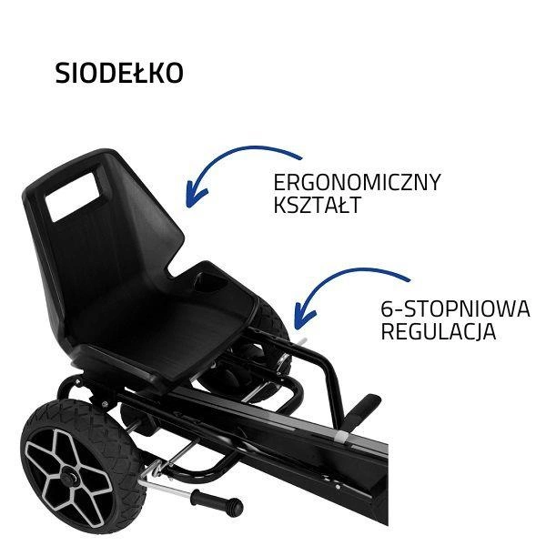 Pojazd przeznaczony jest dla dzieci od 5 roku życia. Dzięki sześciostopniowej regulacji siedziska, łatwo dostosujesz odpowiednią odległość od pedałów do wzrostu dziecka. To sprawia, że pojazd może być używany przez kilka lat. Ergonomiczne siedzisko zostało wyprofilowane tak, aby zapewnić nie tylko bezpieczeństwo podczas zabawy, ale również wygodę dla małych fanów wyścigów.